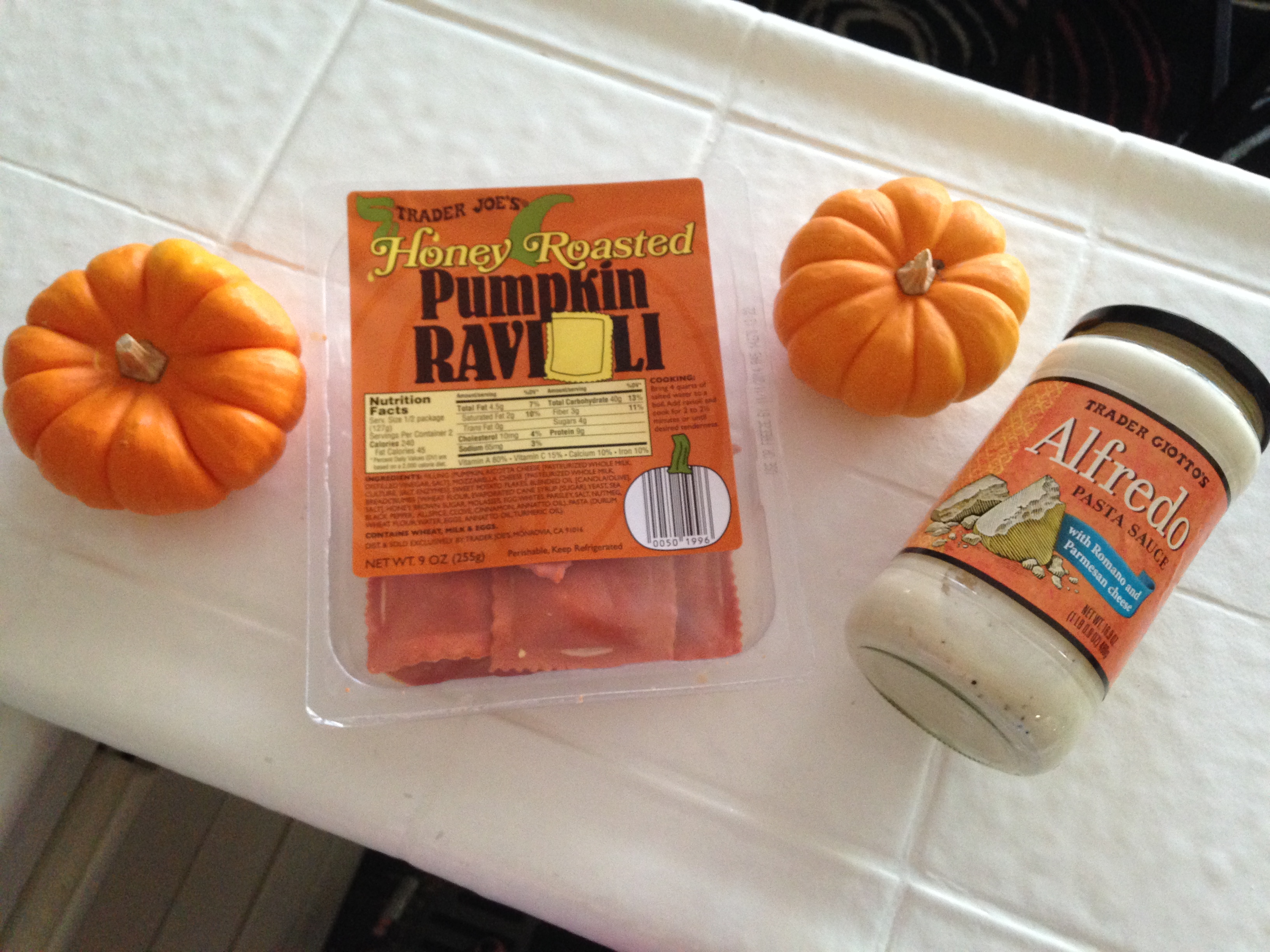 This item was on display with the rest of their pumpkin flavored, seasonal items in the refrigerated case for $3.49. Cooking is extremely easy – just heat up some boiling water and add the ravioli for a few minutes. I also heated up some of the Trader Joe’s Alfredo sauce in a small pan to finish the dish. You could also use a bit of melted butter or a mixture of pumpkin butter and cream. Happy Pumpkin Season!
