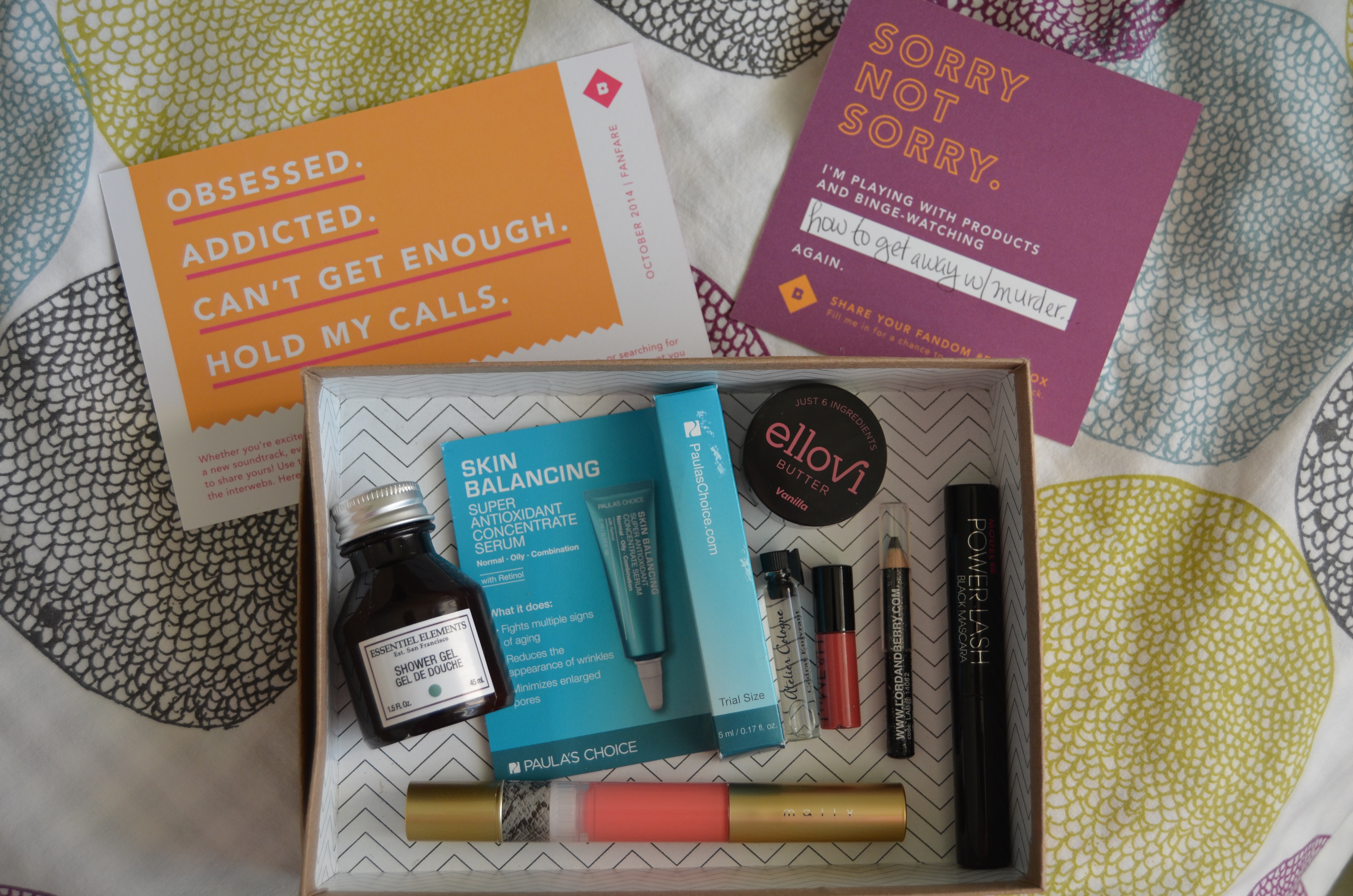 The theme for October 2014 was “Fanfare: Obsessed. Addicted. Can’t Get Enough. Hold My Calls.” This month, Birchbox was sharing all their passions, because everyone has a fan in them. In my box(es) I received: